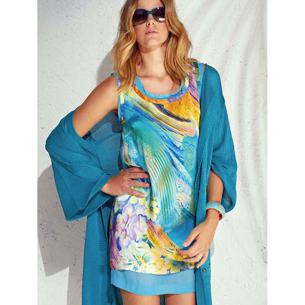 シルク2枚重ねチュニックワンピース ターコイズブルー系