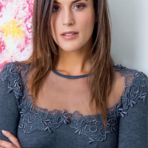 胸元と袖にあしらわれた最高級刺繍レースの切替が